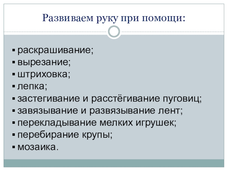 Развиваем руку при помощи: раскрашивание;вырезание;штриховка;лепка;застегивание и расстёгивание пуговиц;завязывание и развязывание лент;перекладывание мелких игрушек;перебирание крупы;мозаика.
