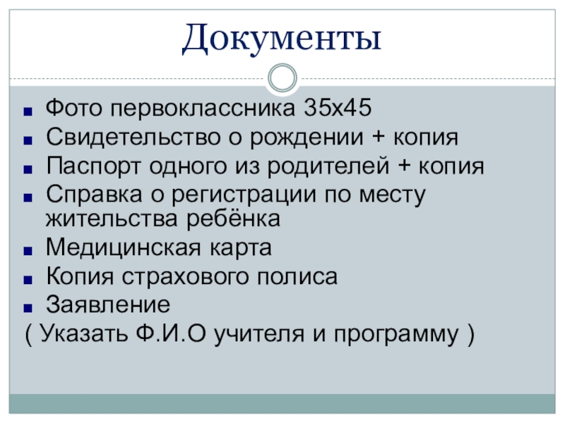ДокументыФото первоклассника 35х45Свидетельство о рождении + копияПаспорт одного из родителей + копияСправка о регистрации по месту жительства