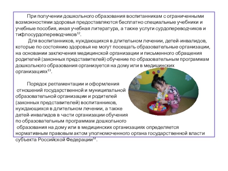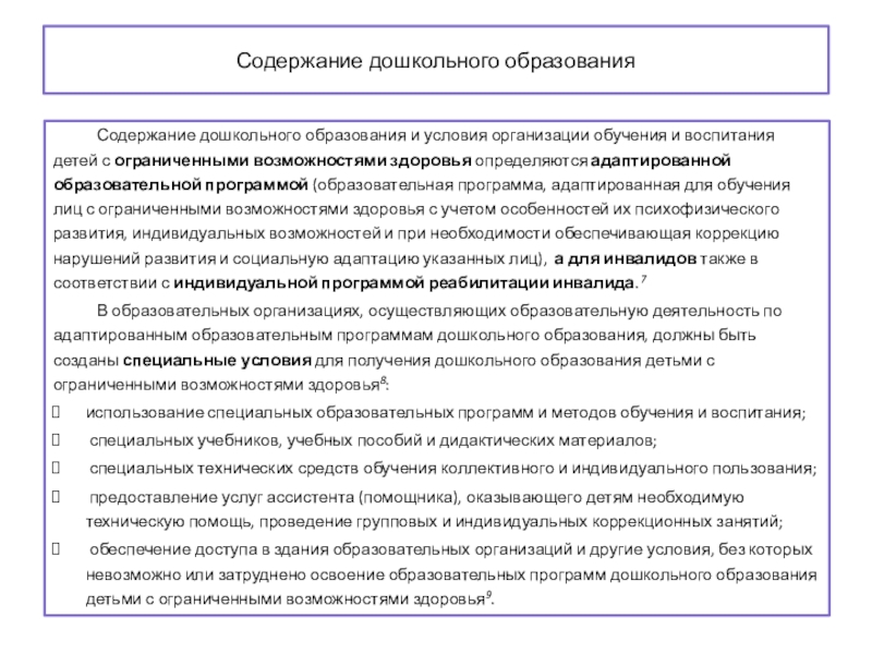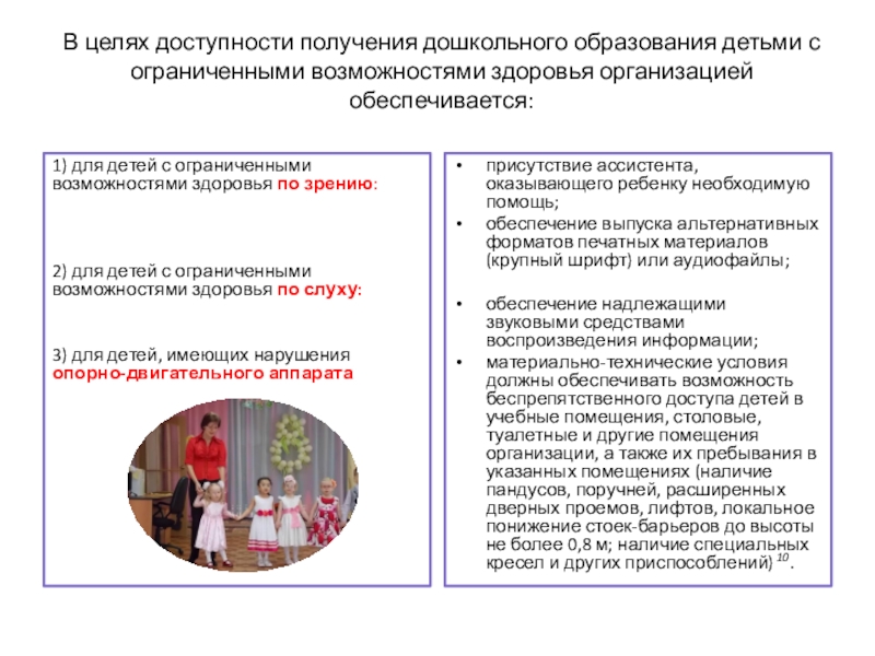 материально-технические условия должны обеспечивать возможность беспрепятственного доступа детей в учебные помещения, столовые, туалетные и другие помещения организации, а также их пребывания в указанных помещениях (наличие пандусов, поручней, расширенных дверных проемов, лифтов, локальное понижение стоек-барьеров до высоты не более 0,8 м; наличие специальных кресел и других приспособлений) 10.