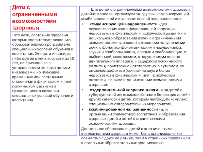 - это дети, состояние здоровья которых препятствует освоению образовательных программ вне специальных условий обучения и воспитания. Это дети-инвалиды либо другие дети в возрасте до 18 лет, не признанные в установленном порядке детьми-инвалидами, но имеющие временные или постоянные отклонения в физическом и (или) психическом развитии и нуждающиеся в создании специальных условий обучения и воспитания.