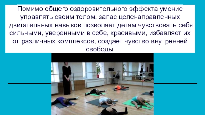 Слайд 7Помимо общего оздоровительного эффекта умение управлять своим телом, запас целенаправленных двигательных