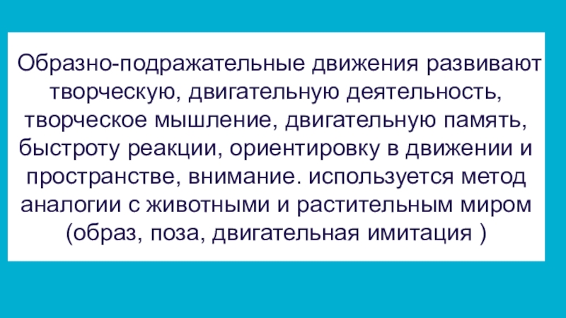 Слайд 9Образно-подражательные движения развивают творческую, двигательную деятельность, творческое мышление, двигательную память, быстроту