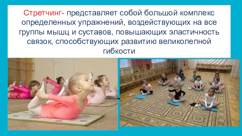 Слайд 3Стретчинг- представляет собой большой комплекс определенных упражнений, воздействующих на все группы