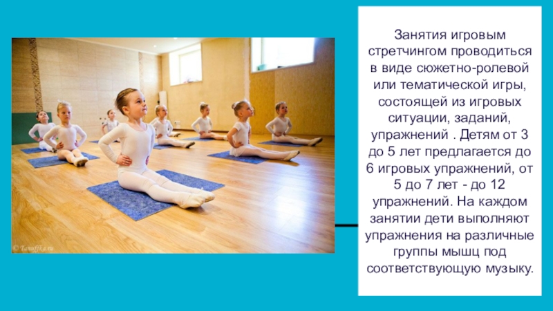 Слайд 8Занятия игровым стретчингом проводиться в виде сюжетно-ролевой или тематической игры, состоящей
