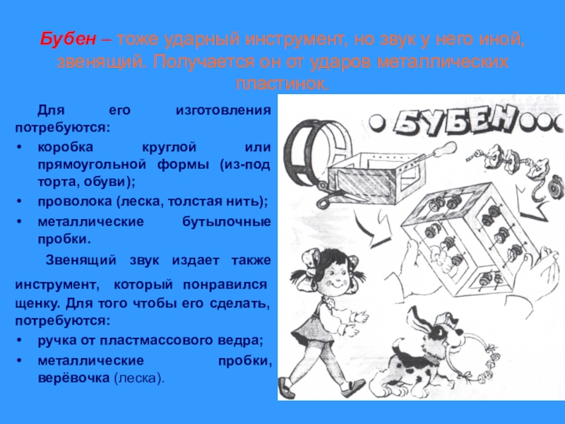 Звенящий звук издает также инструмент, который понравился щенку. Для того чтобы его сделать, потребуются: