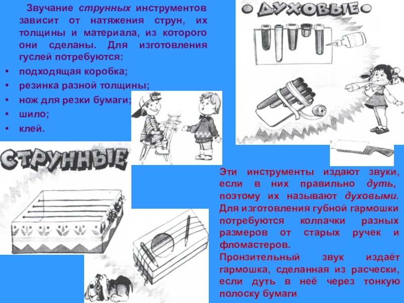 Звучание струнных инструментов зависит от натяжения струн, их толщины и материала, из которого они сделаны. Для изготовления гуслей потребуются: