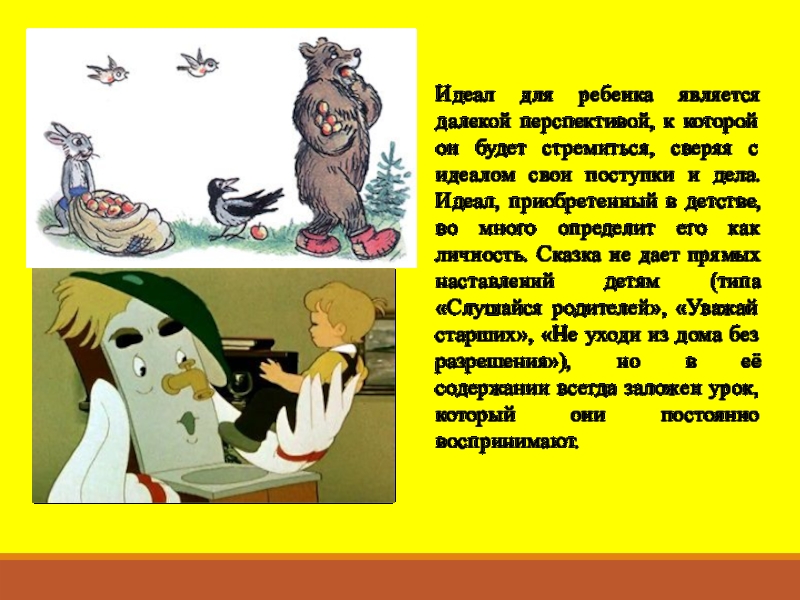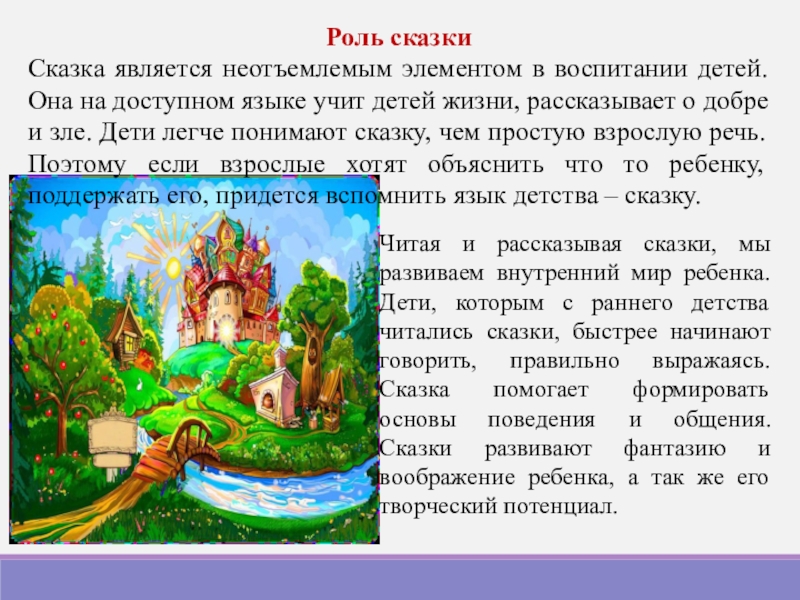 Читая и рассказывая сказки, мы развиваем внутренний мир ребенка. Дети, которым с раннего детства читались сказки, быстрее начинают говорить, правильно выражаясь. Сказка помогает формировать основы поведения и общения. Сказки развивают фантазию и воображение ребенка, а так же его творческий потенциал.