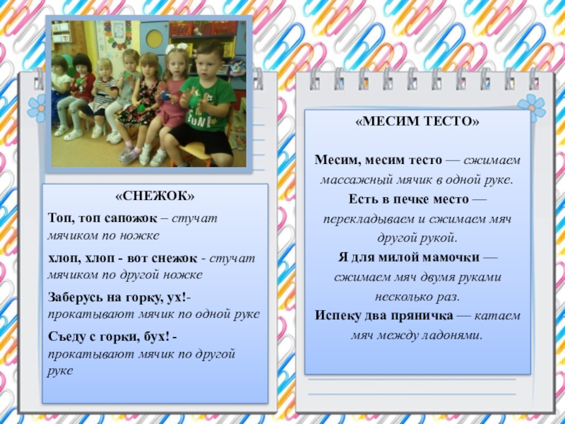 Месим, месим тесто — сжимаем массажный мячик в одной руке.