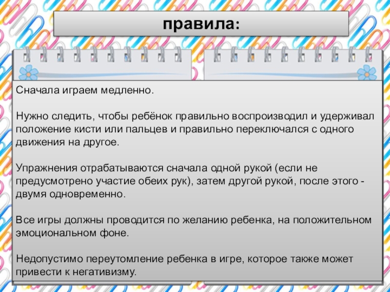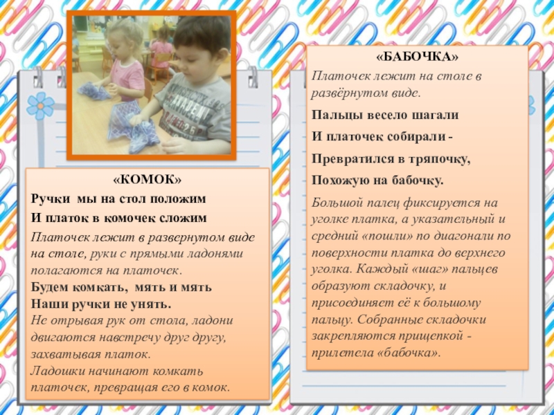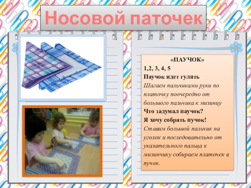 Платочек лежит в развернутом виде на столе, руки с прямыми ладонями полагаются на платочек.