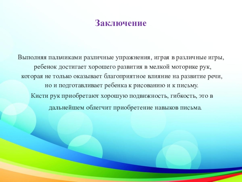 Кисти рук приобретают хорошую подвижность, гибкость, это в дальнейшем облегчит приобретение навыков письма.