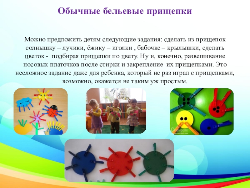прищепок солнышку – лучики, ёжику – иголки , бабочке – крылышки, сделать цветок - подбирая прищепки по цвету. Ну и, конечно, развешивание носовых платочков после стирки и закрепление их прищепками. Это несложное задание даже для ребенка, который не раз играл с прищепками, возможно, окажется не таким уж простым.