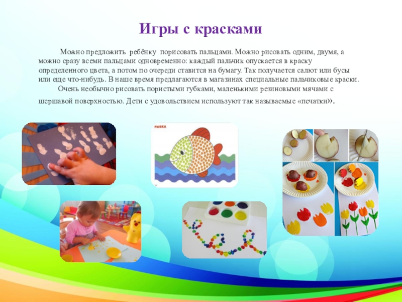 двумя, а можно сразу всеми пальцами одновременно: каждый пальчик опускается в краску определенного цвета, а потом по очереди ставится на бумагу. Так получается салют или бусы или еще что-нибудь. В наше время предлагаются в магазинах специальные пальчиковые краски.