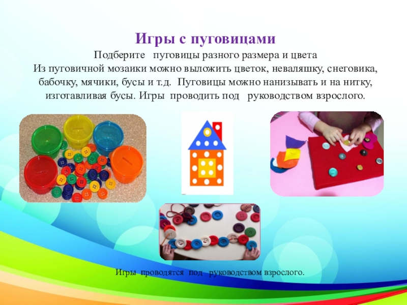можно выложить цветок, неваляшку, снеговика, бабочку, мячики, бусы и т.д. Пуговицы можно нанизывать и на нитку, изготавливая бусы. Игры проводить под руководством взрослого.
