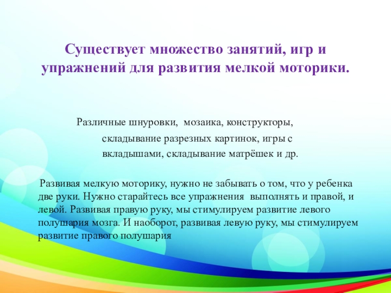 Развивая мелкую моторику, нужно не забывать о том, что у ребенка две руки. Нужно старайтесь все упражнения выполнять и правой, и левой. Развивая правую руку, мы стимулируем развитие левого полушария мозга. И наоборот, развивая левую руку, мы стимулируем развитие правого полушария