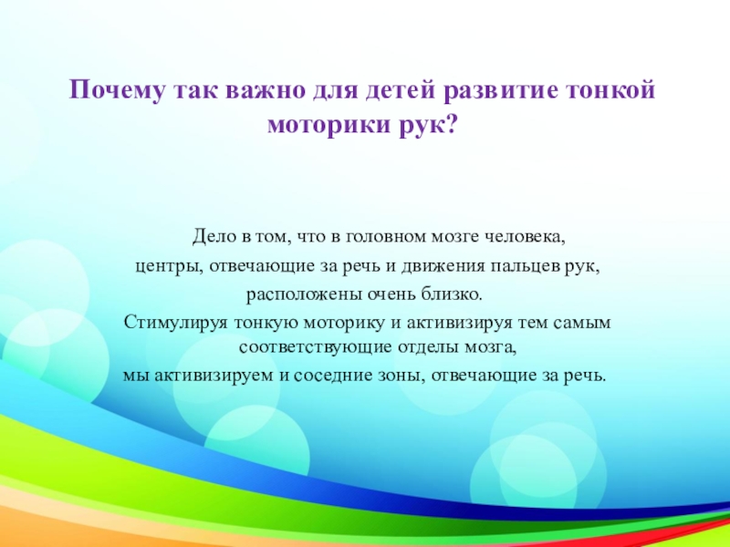 Слайд 3Почему так важно для детей развитие тонкой моторики рук?