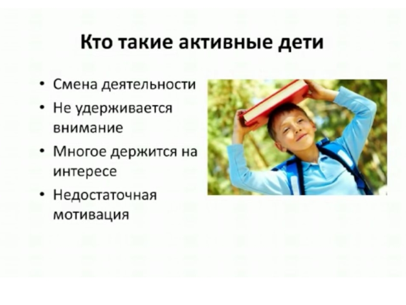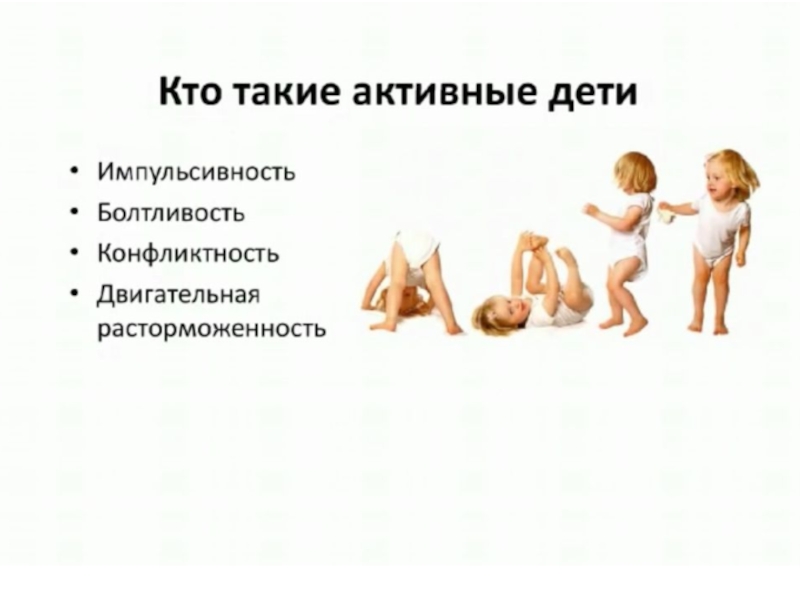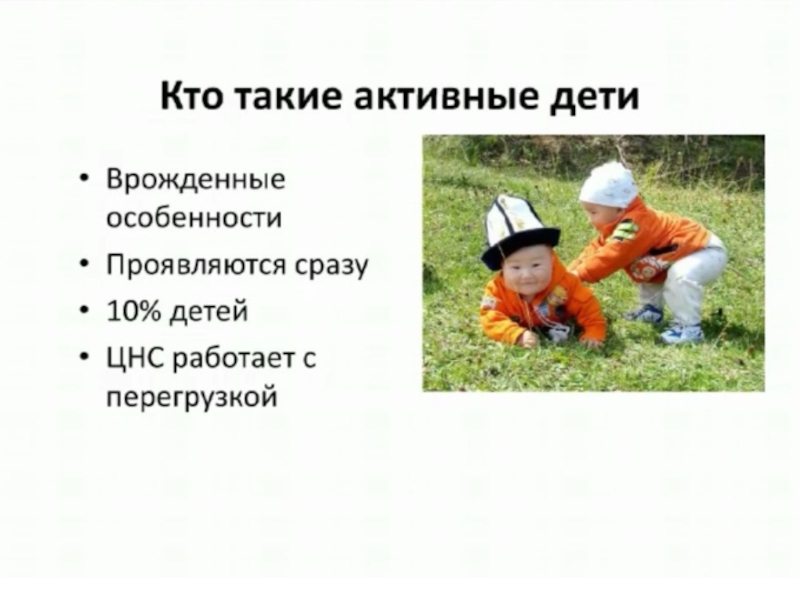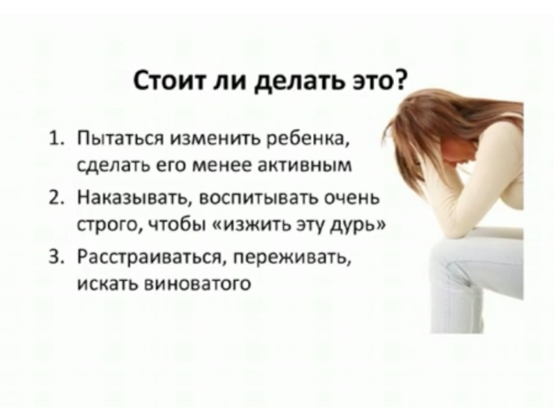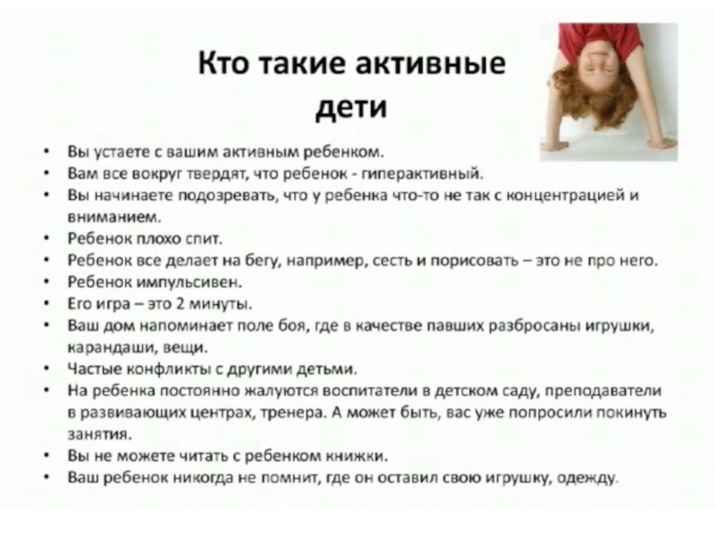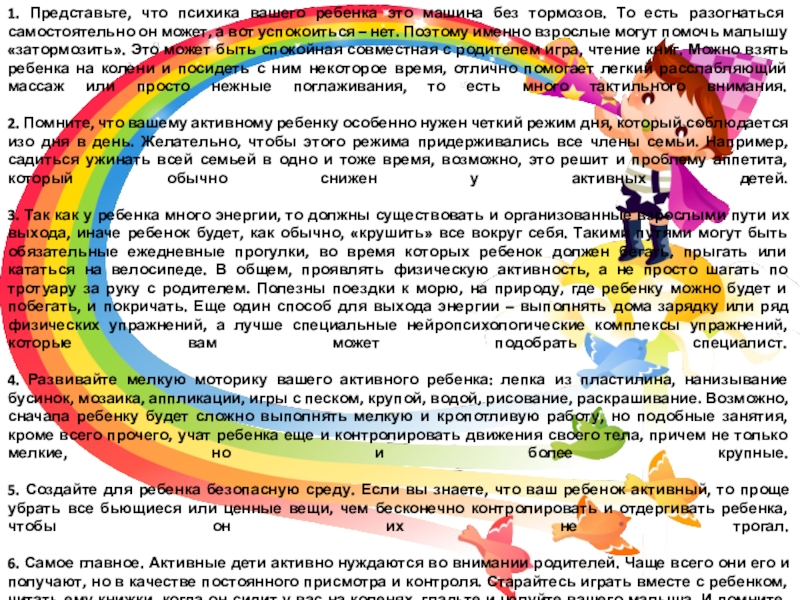 6. Самое главное. Активные дети активно нуждаются во внимании родителей. Чаще всего они его и получают, но в качестве постоянного присмотра и контроля. Старайтесь играть вместе с ребенком, читать ему книжки, когда он сидит у вас на коленях, гладьте и целуйте вашего малыша. И помните, что ребенок отражает ваше эмоциональное состояние: чем спокойнее будете вы, тем спокойнее будет и малыш.