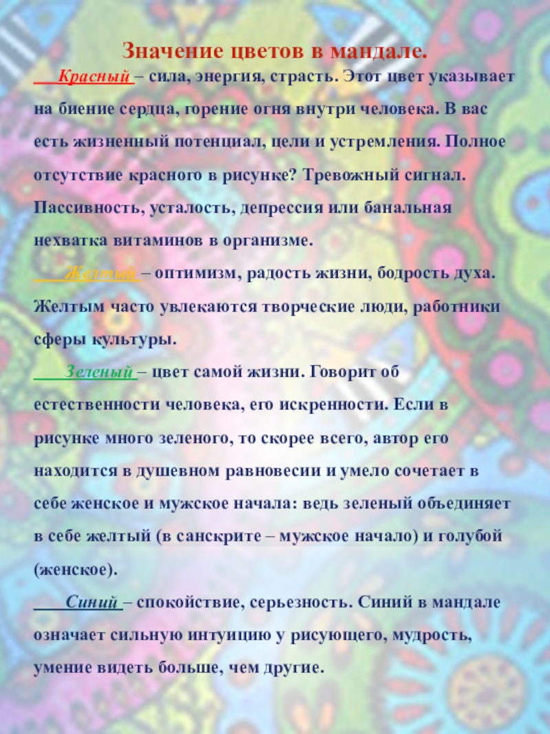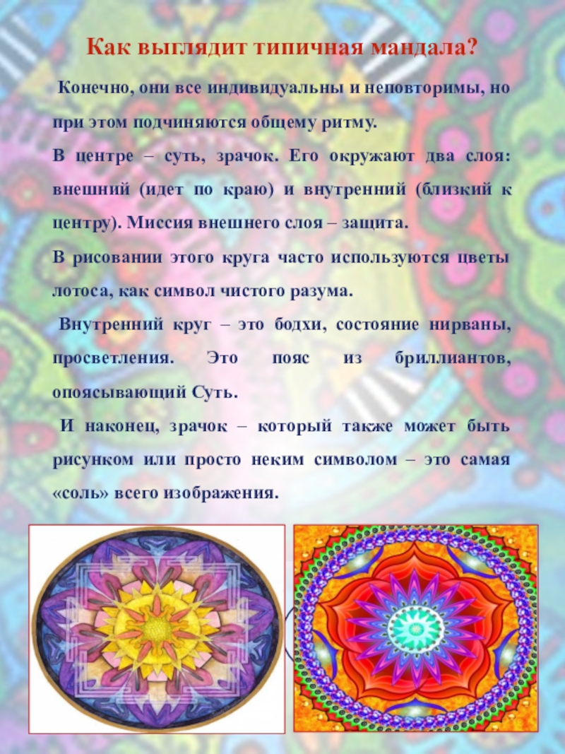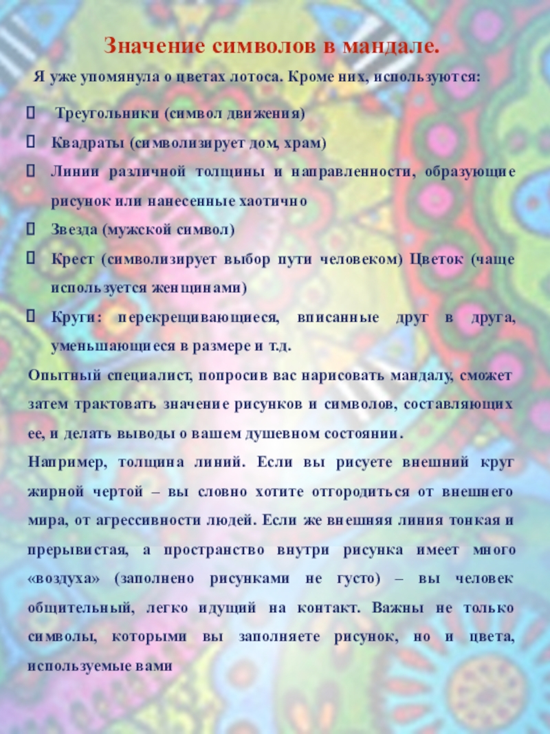 Опытный специалист, попросив вас нарисовать мандалу, сможет затем трактовать значение рисунков и символов, составляющих ее, и делать выводы о вашем душевном состоянии.