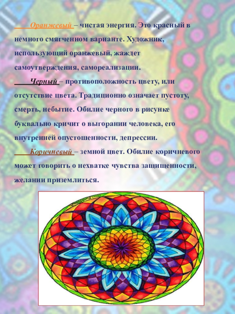 немного смягченном варианте. Художник, использующий оранжевый, жаждет самоутверждения, самореализации.