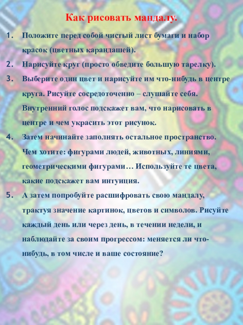 А затем попробуйте расшифровать свою мандалу, трактуя значение картинок, цветов и символов. Рисуйте каждый день или через день, в течении недели, и наблюдайте за своим прогрессом: меняется ли что-нибудь, в том числе и ваше состояние?