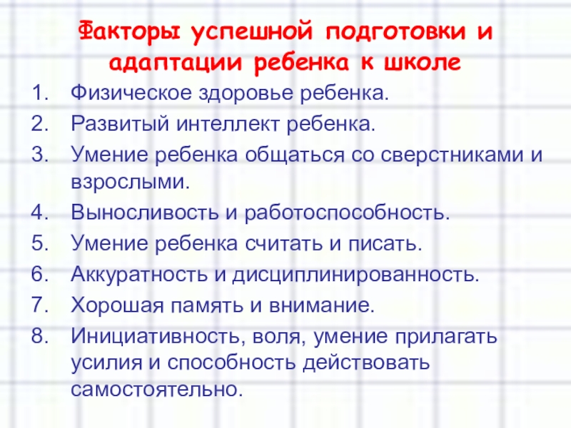 Факторы успешной подготовки и адаптации ребенка к школеФизическое здоровье ребенка.Развитый интеллект ребенка.Умение ребенка общаться со сверстниками и взрослыми.Выносливость и работоспособность.Умение ребенка считать и писать.Аккуратность и дисциплинированность.Хорошая память и внимание.Инициативность, воля, умение прилагать усилия и способность действовать