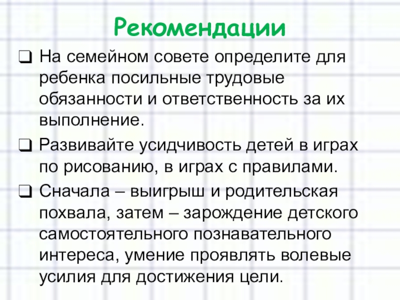 РекомендацииНа семейном совете определите для ребенка посильные трудовые обязанности и ответственность за их выполнение.Развивайте усидчивость детей в