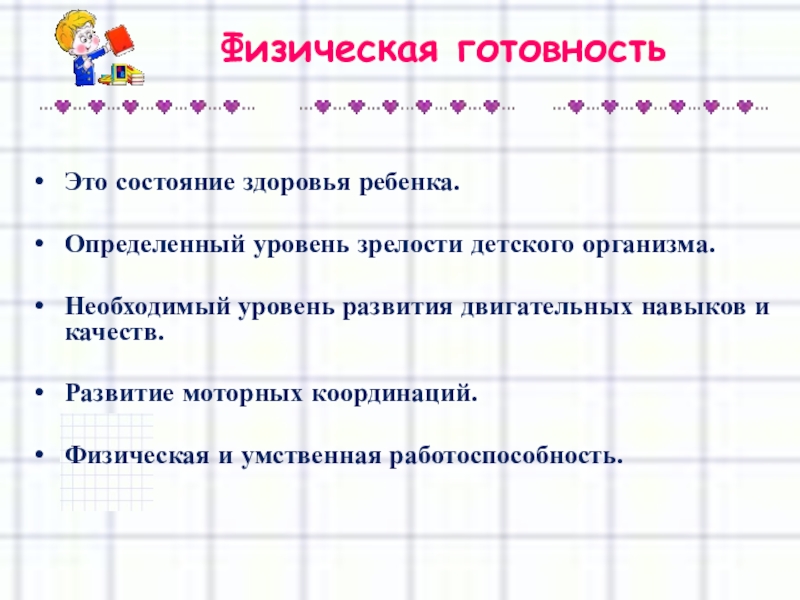 Физическая готовность Это состояние здоровья ребенка.Определенный уровень зрелости детского организма. Необходимый уровень развития двигательных навыков и качеств.Развитие