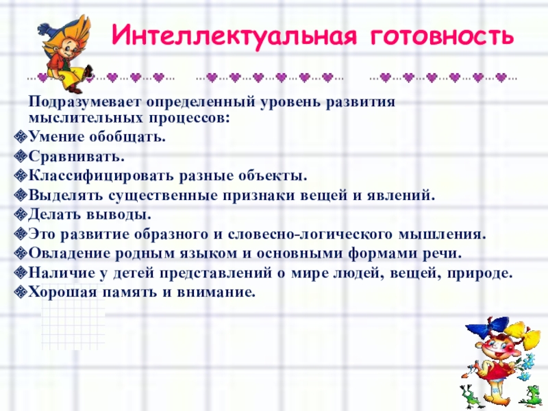 Интеллектуальная готовностьПодразумевает определенный уровень развития мыслительных процессов:Умение обобщать.Сравнивать.Классифицировать разные объекты.Выделять существенные признаки вещей и явлений.Делать выводы.Это развитие