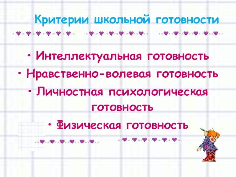 Критерии школьной готовности Интеллектуальная готовностьНравственно-волевая готовностьЛичностная психологическая готовностьФизическая готовность