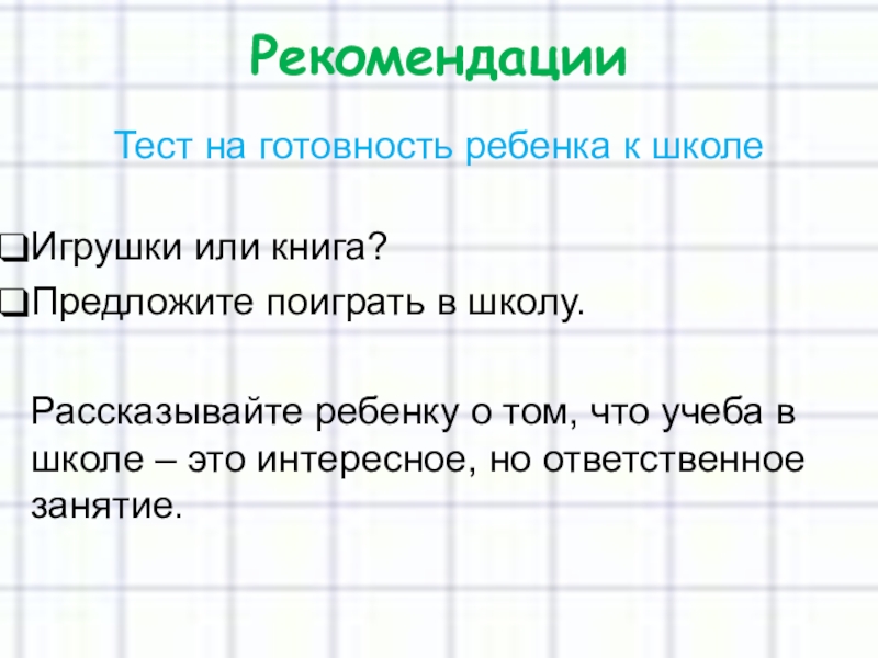 РекомендацииТест на готовность ребенка к школеИгрушки или книга?Предложите поиграть в школу.Рассказывайте ребенку о том, что учеба в