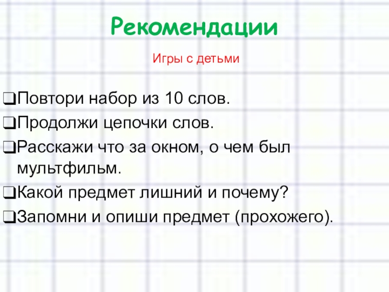 Рекомендации Игры с детьмиПовтори набор из 10 слов.Продолжи цепочки слов.Расскажи что за окном, о чем был мультфильм.Какой