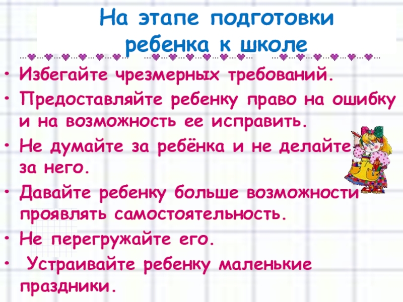 На этапе подготовки  ребенка к школеИзбегайте чрезмерных требований.Предоставляйте ребенку право на ошибку и на возможность ее