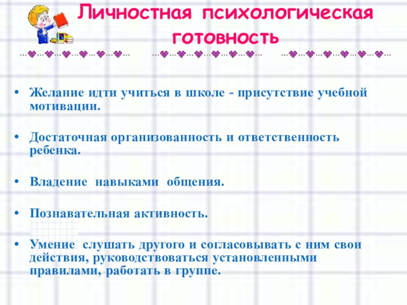 Личностная психологическая готовность Желание идти учиться в школе - присутствие учебной мотивации.Достаточная организованность и ответственность ребенка.Владение навыками