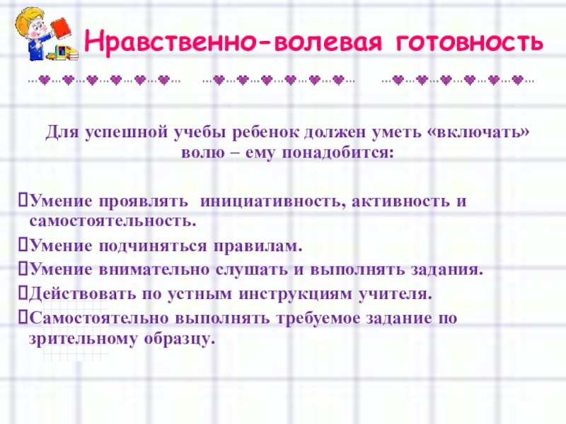 Нравственно-волевая готовностьДля успешной учебы ребенок должен уметь «включать» волю – ему понадобится:Умение проявлять инициативность, активность и самостоятельность.Умение