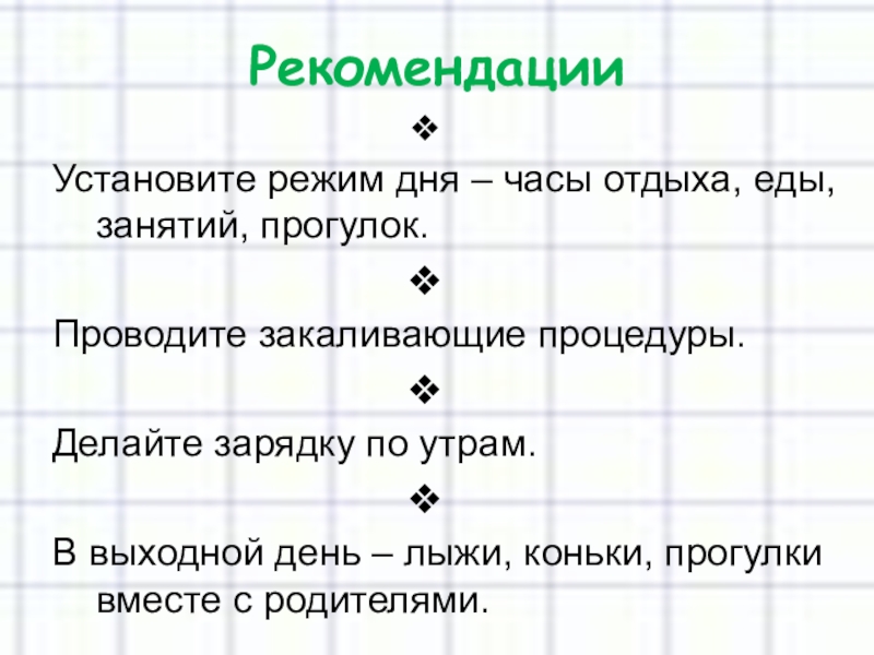 Рекомендации Установите режим дня – часы отдыха, еды, занятий, прогулок. Проводите закаливающие процедуры. Делайте зарядку по утрам.