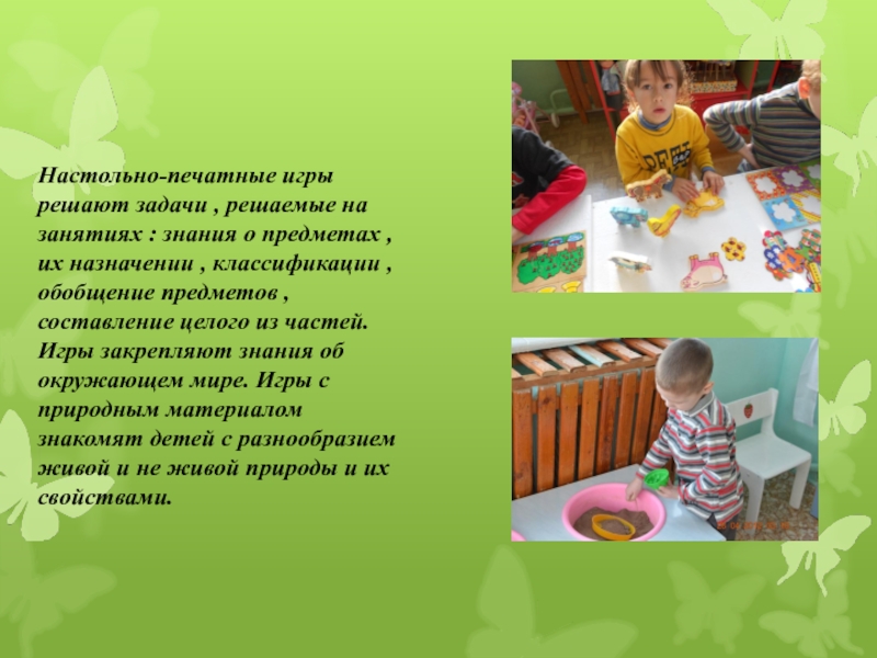 предметах , их назначении , классификации , обобщение предметов , составление целого из частей. Игры закрепляют знания об окружающем мире. Игры с природным материалом знакомят детей с разнообразием живой и не живой природы и их свойствами.