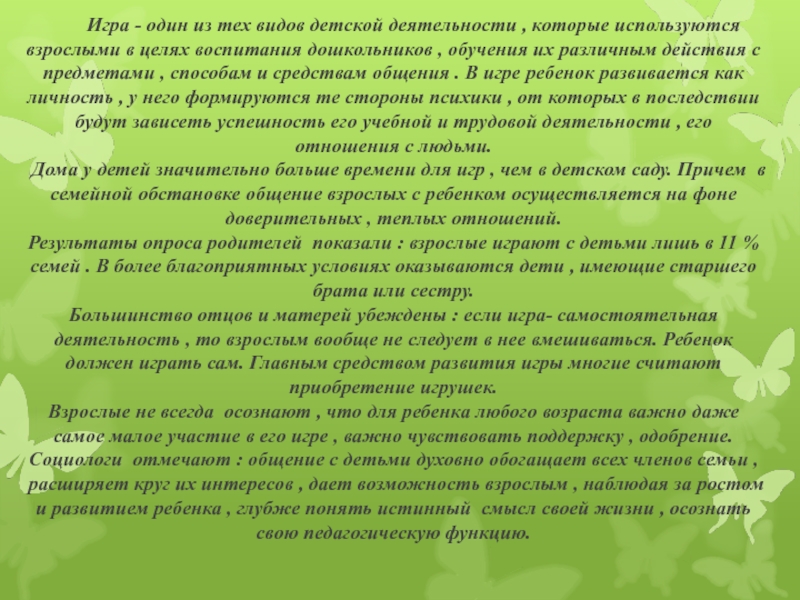 Дома у детей значительно больше времени для игр , чем в детском саду. Причем в семейной обстановке общение взрослых с ребенком осуществляется на фоне доверительных , теплых отношений.