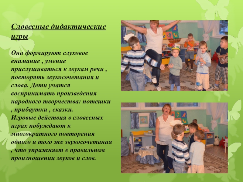 Игровые действия в словесных играх побуждают к многократного повторения одного и того же звукосочетания , что упражняет в правильном произношении звуков и слов.