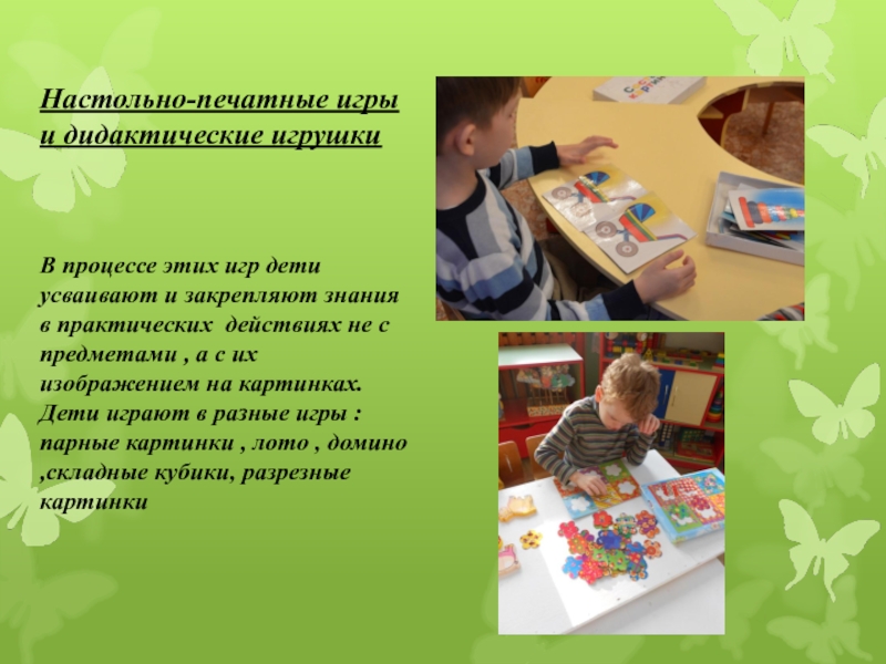 закрепляют знания в практических действиях не с предметами , а с их изображением на картинках. Дети играют в разные игры : парные картинки , лото , домино ,складные кубики, разрезные картинки