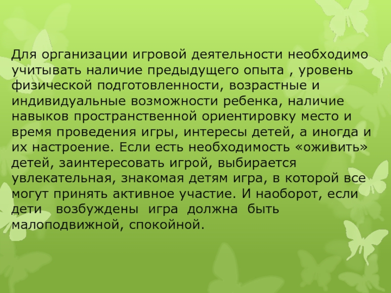 Слайд 23Для организации игровой деятельности необходимо учитывать наличие предыдущего опыта , уровень