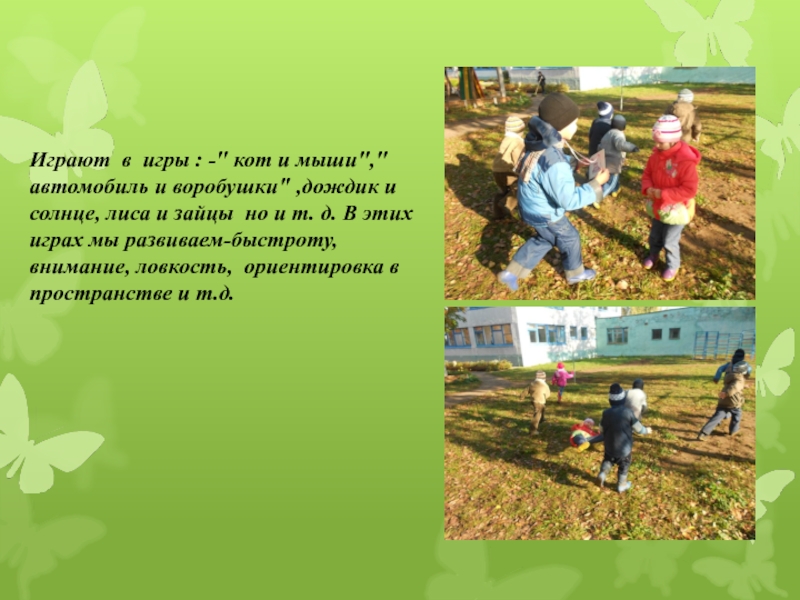 Играют в игры : -" кот и мыши"," автомобиль и воробушки"