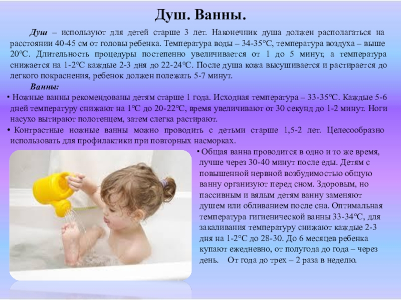 должен располагаться на расстоянии 40-45 см от головы ребенка. Температура воды – 34-35°С, температура воздуха – выше 20°С. Длительность процедуры постепенно увеличивается от 1 до 5 минут, а температура снижается на 1-2°С каждые 2-3 дня до 22-24°С. После душа кожа высушивается и растирается до легкого покраснения, ребенок должен полежать 5-7 минут.