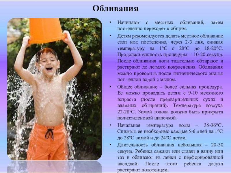 Общее обливание – более сильная процедура. Ее можно проводить детям с 9-10 месячного возраста (после предварительных сухих и влажных обтираний). Температура воздуха 22-28°С. Зимой голова должна быть прикрыта полиэтиленовой шапочкой.