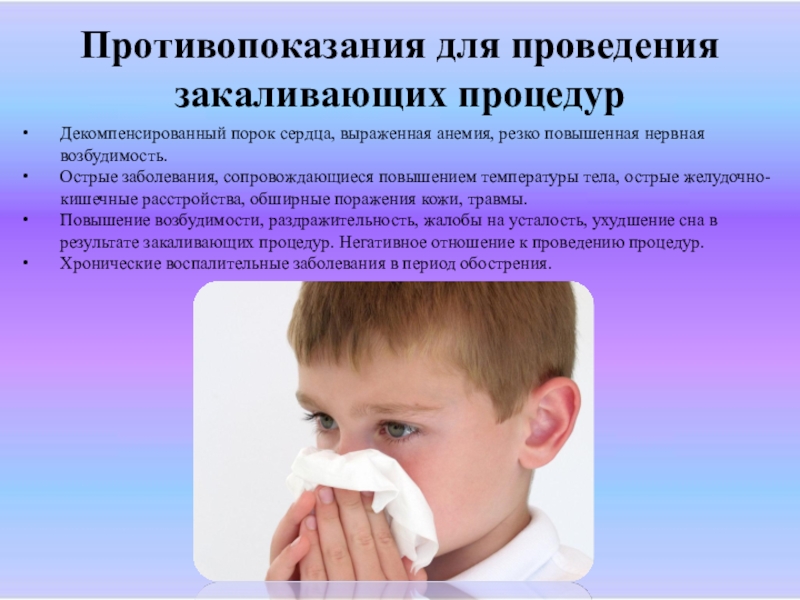 Слайд 3Противопоказания для проведения закаливающих процедур