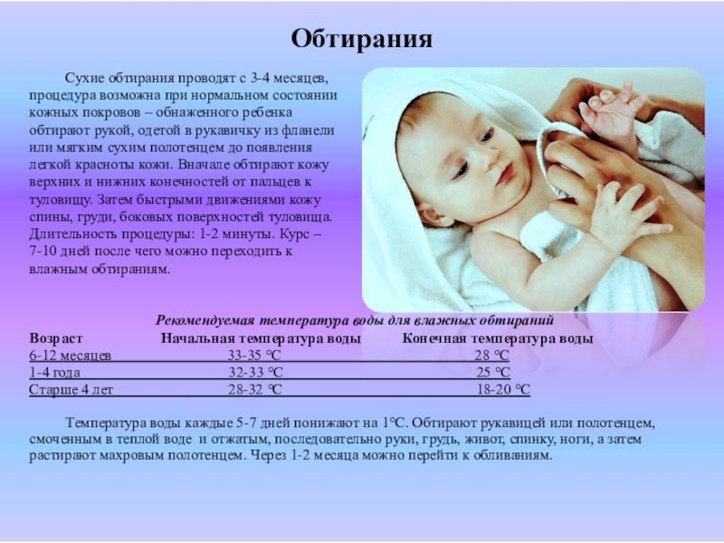 Температура воды каждые 5-7 дней понижают на 1°С. Обтирают рукавицей или полотенцем, смоченным в теплой воде и отжатым, последовательно руки, грудь, живот, спинку, ноги, а затем растирают махровым полотенцем. Через 1-2 месяца можно перейти к обливаниям.