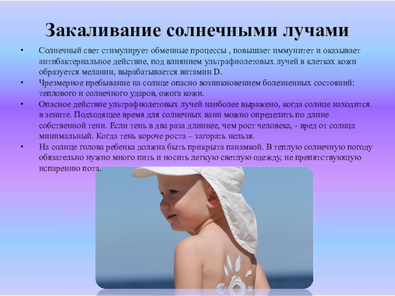 На солнце голова ребенка должна быть прикрыта панамкой. В теплую солнечную погоду обязательно нужно много пить и носить легкую светлую одежду, не препятствующую испарению пота.