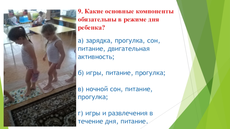 Слайд 219. Какие основные компоненты обязательны в режиме дня ребенка?
