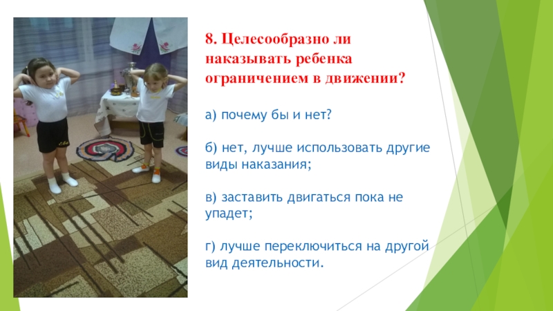 Слайд 198. Целесообразно ли наказывать ребенка ограничением в движении?