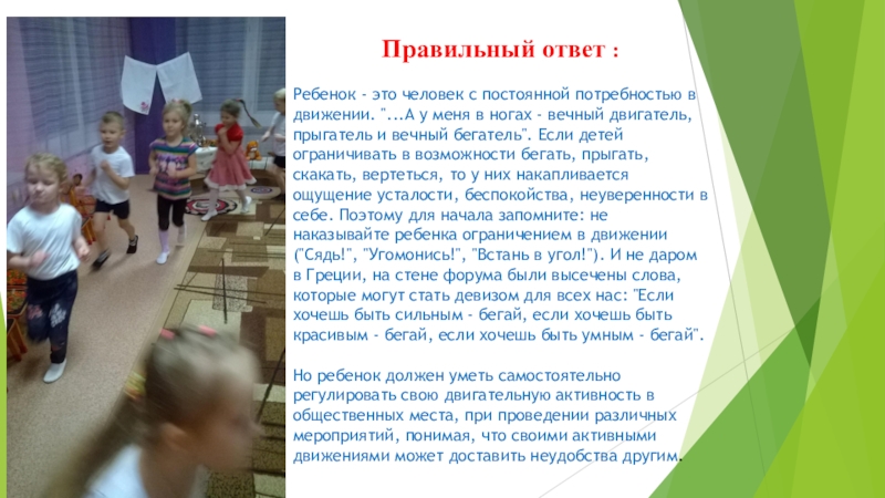 "...А у меня в ногах - вечный двигатель, прыгатель и вечный бегатель". Если детей ограничивать в возможности бегать, прыгать, скакать, вертеться, то у них накапливается ощущение усталости, беспокойства, неуверенности в себе. Поэтому для начала запомните: не наказывайте ребенка ограничением в движении ("Сядь!", "Угомонись!", "Встань в угол!"). И не даром в Греции, на стене форума были высечены слова, которые могут стать девизом для всех нас: "Если хочешь быть сильным - бегай, если хочешь быть красивым - бегай, если хочешь быть умным - бегай".