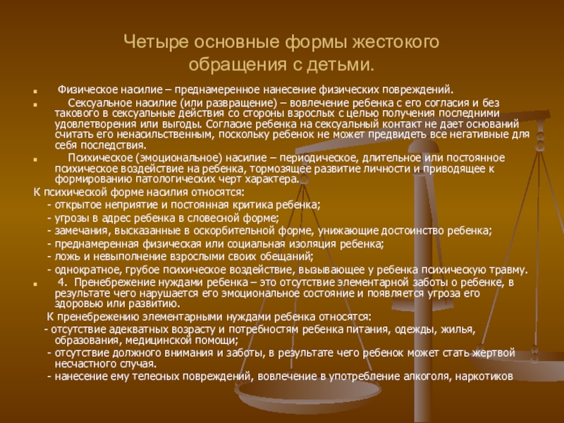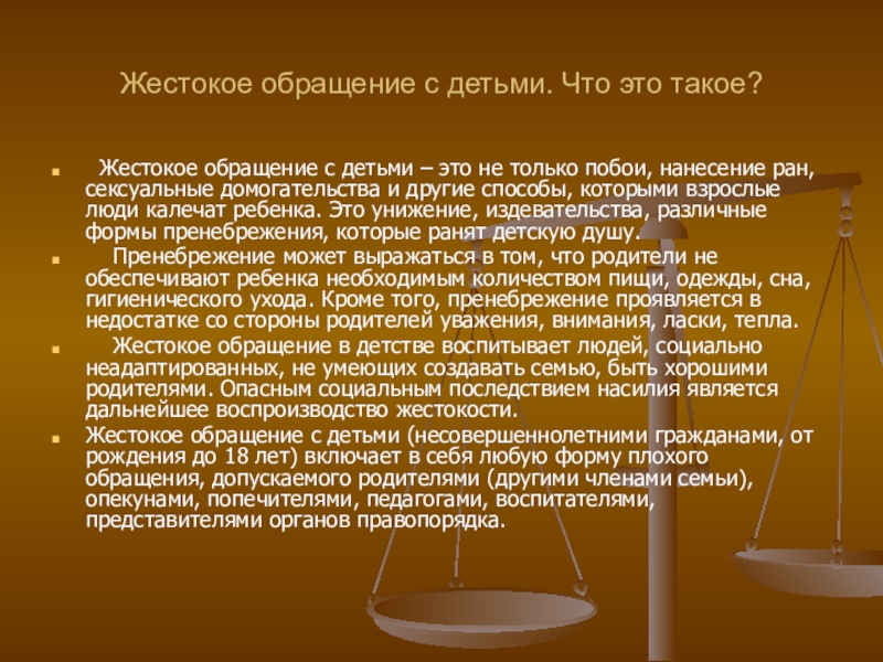 Жестокое обращение с детьми (несовершеннолетними гражданами, от рождения до 18 лет) включает в себя любую форму плохого обращения, допускаемого родителями (другими членами семьи), опекунами, попечителями, педагогами, воспитателями, представителями органов правопорядка.