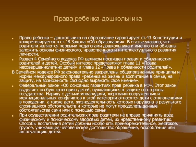 конкретизируется в ст.18.Закона «Об образовании». В статье указано, что родители являются первыми педагогами дошкольника и именно они обязаны заложить основы физического, нравственного и интеллектуального развития личности.
